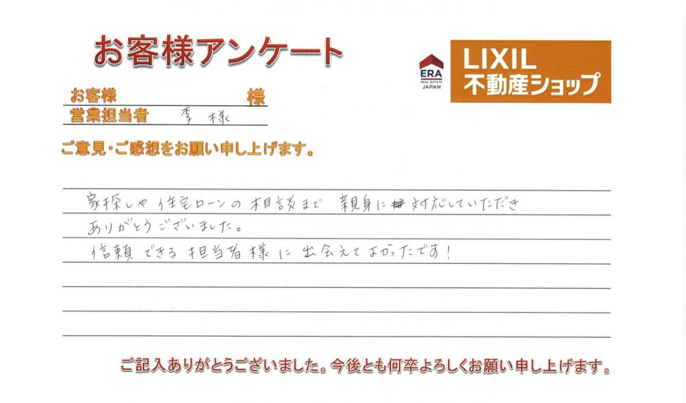 この度は新居のご購入おめでとうございます! こちらこそ本当にありがとうございました。 ご希望に沿う物件をご紹介できた事を、とても光栄に思っております。 お手続きも丁寧に行って頂きまして、大変助かりました。 これからの新居での新しい生活がとても楽しみですね。 ご家族の皆様とどうぞお健やかにお過ごし下さいませ。 何かございましたら、ぜひお気軽にご連絡頂けますと幸いです。 今後ともどうぞ宜しくお願い致します。