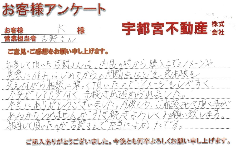 この度は数ある中から当社にお問い合わせ、ご契約をいただき本当にありがとうございました。 お家探しは初めての事も皆様多いと思いますので、何から手を付けて良いか等もわからない事もたくさんあったかと思います。その中で私自身の周りの友人やお客様などの経験も踏まえて、色々とお伝えさせて頂いた内容が少しでもお役に立てた様でしたら光栄です! 可愛らしいお子様達も皆ご家族仲良くご見学されていたのが印象的でした。 これからはお子様達もお友達をおうちに呼ぶのを楽しみにされているかと思いますが、素敵なマイホームでご家族皆様との楽しい思い出とお時間をたくさん作って頂ければ幸いです。 お忙しい中色々とお時間などご調整頂きありがとうございました。