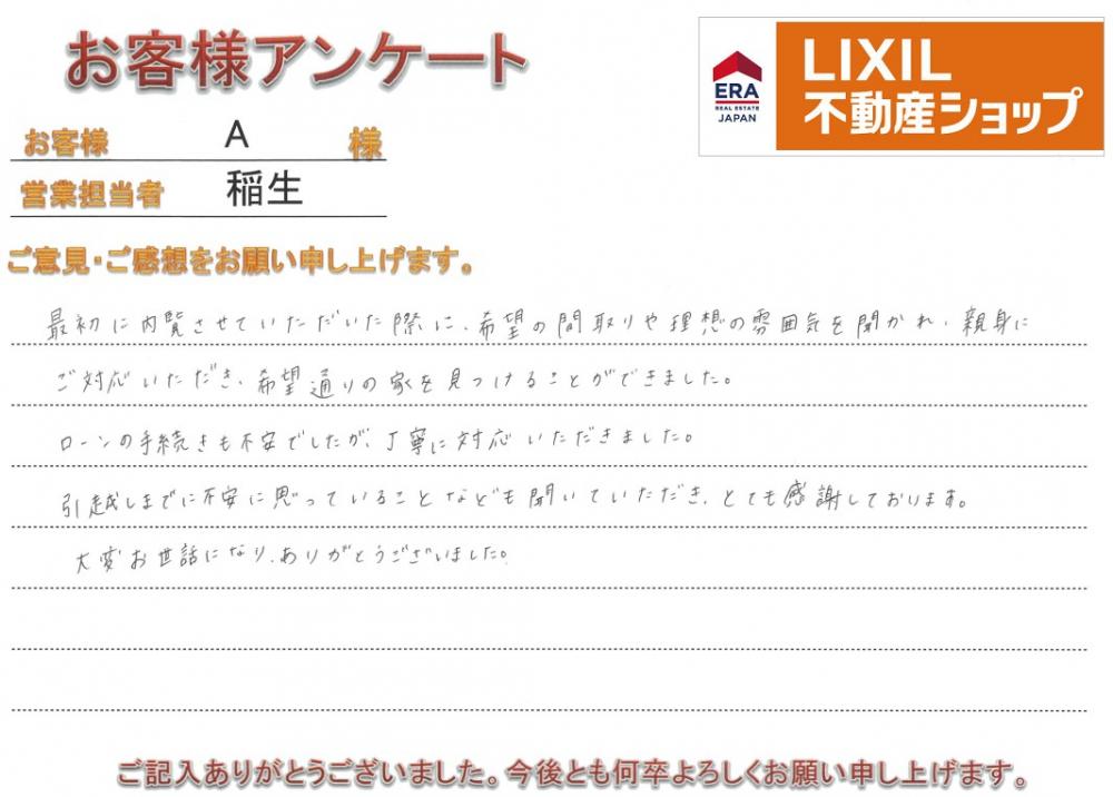 新しいお住まいでの生活が、A様にとって笑顔の絶えない素晴らしいものになりますよう心よりお祈り申し上げます。 今後も何かお困りごとがございましたら、いつでもお気軽にご連絡ください。 末永いお付き合いのほど、よろしくお願い申し上げます。