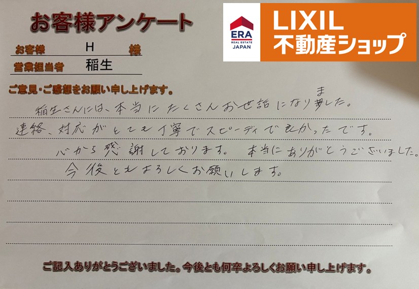 特に、連絡のスピードや対応について「助かった」とのお言葉をいただけたことは、私にとって何よりの励みになります。H様の大切な住まい探しのお手伝いができましたこと、心より光栄に存じます。